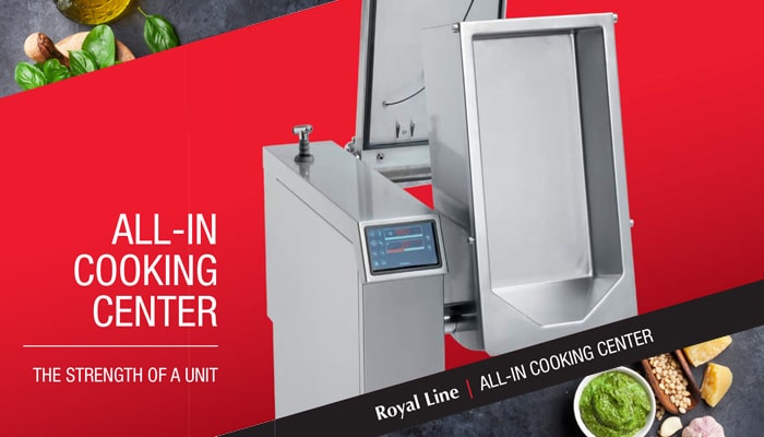 The multi-purpose ALL-IN COOKING CENTER cooking pan can replace an oven in the preparation of braises, shins, boiled meats, or in combination with combi oven, doubling the preparation of dishes by being able to prepare first courses, sauces, hot plate dishes and desserts.