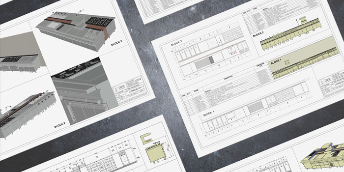 recent layout drawings and renders for a large, multi kitchen installation