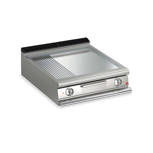 Two burner, bench model electric fry top 2/3 smooth and 1/3 ribbed chrome plate. Thermostat control. Knobs with IPX5 water jet ingress protection rating. AISI304 stainless steel construction. Total power - 3 phase, 10.8kW.Dimensions: