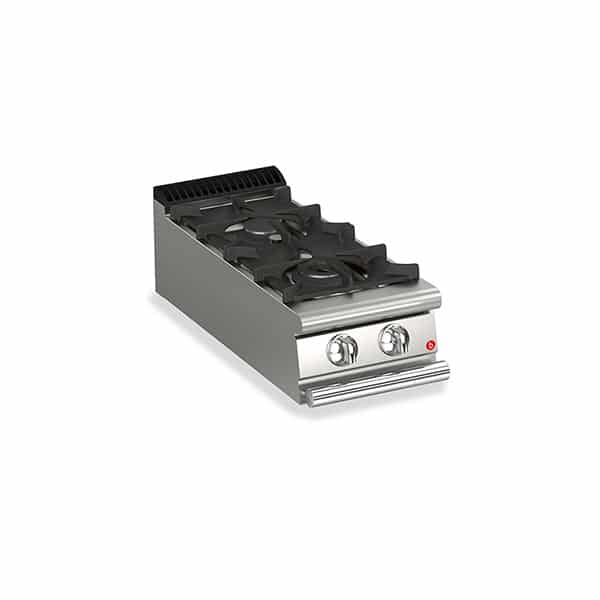 Two burner, bench model gas cook top. Flame failure device for burners. Knobs with IPX5 water jet ingress protection rating. AISI304 stainless steel construction. Total gas load - 44 Mj.Dimensions: