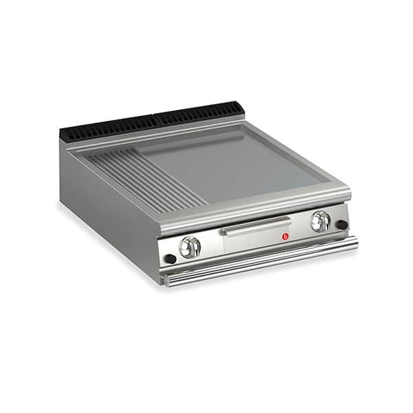 Two burner, bench model gas fry top with 2/3 smooth and 1/3 ribbed mild steel plate. Piezo ignition and flame failure device. Knobs with IPX5 water jet ingress protection rating. AISI304 stainless steel construction. Total gas load - 50 Mj.Dimensions: