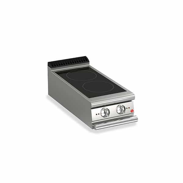 Two burner, bench model electric induction cook top. 230 mm diameter circular cooking zones. Knobs with IPX5 water jet ingress protection rating. AISI304 stainless steel construction. Total power - 3 phase, 7kw.Dimensions: