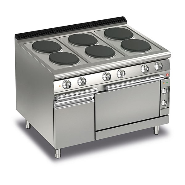 Six burner solid plate electric cook top with electric oven and neutral cupboard. 220 mm diameter cast iron elements. Knobs with IPX5 water jet ingress protection rating. AISI306 stainless steel construction. Total power - 3 phase, 21.6kw.