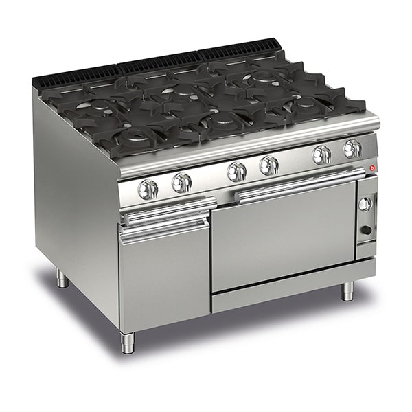 Six burner gas range with gas oven and neutral cupboard. Flame failure device for burners. Knobs with IPX5 water jet ingress protection rating. AISI304 stainless steel construction. Total gas load - 157 Mj.Dimensions: