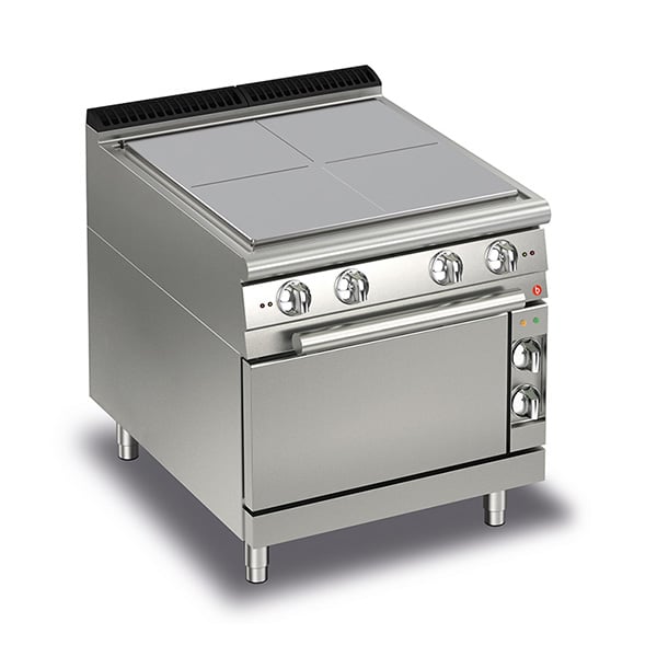 Electric target top with electric oven. Cooking plate in polished chrome, 1.8 mm thick, high temperature resistant, and suitable for direct cooking. Heating elements temperature adjustment via thermostat. Knobs with IPX5 water jet ingress protection rating. AISI304 stainless steel construction. Total power - 3 phase, 16kW.