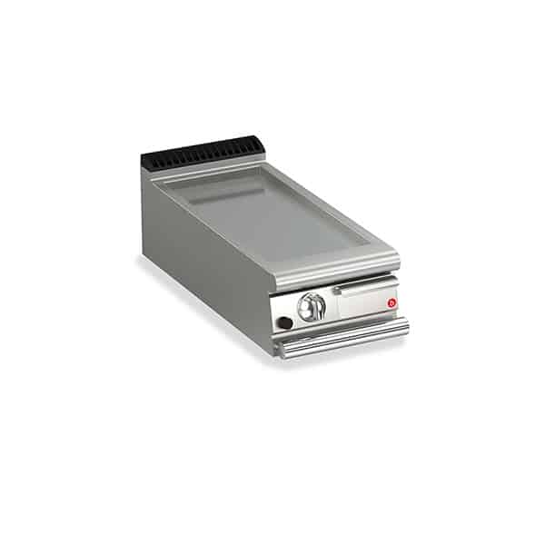 One burner, bench model gas fry top with smooth chrome plate. Piezo ignition, flame failure device and thermostat control. Knobs with IPX5 water jet ingress protection rating. AISI304 stainless steel construction. Total gas load - 33 Mj.Dimensions:
