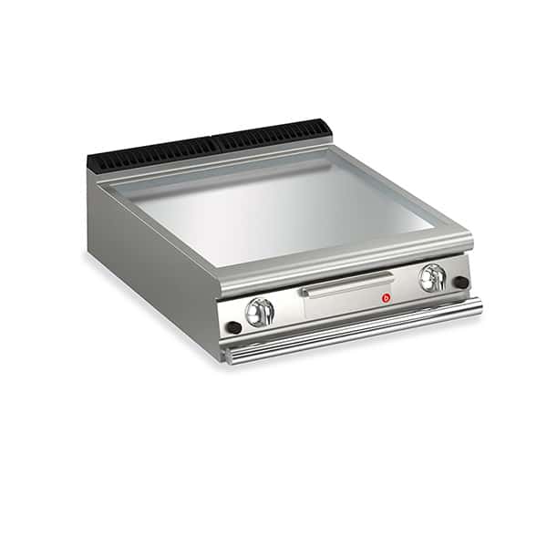 Two burner, bench model gas fry top with smooth chrome plate. Piezo ignition, flame failure device and thermostat control. Knobs with IPX5 water jet ingress protection rating. AISI304 stainless steel construction. Total gas load - 62 Mj.