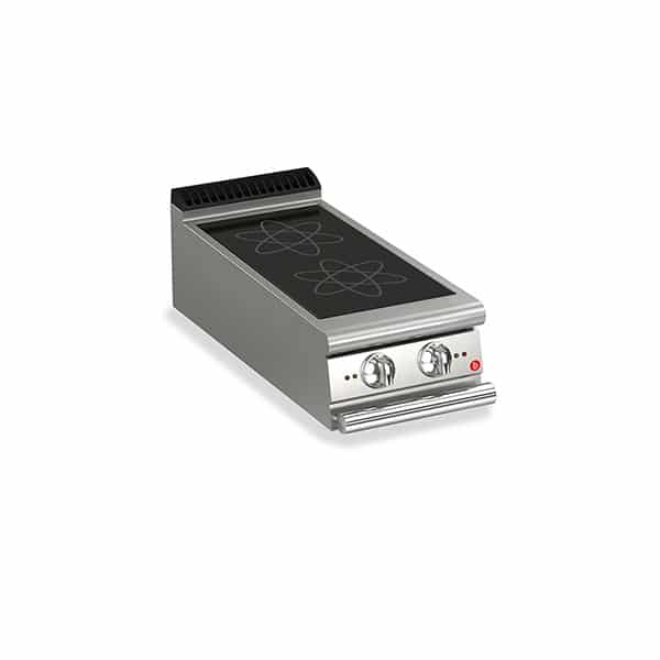 Two burner, bench model electric induction cook top. 280 mm diameter circular cooking zones. Knobs with IPX5 water jet ingress protection rating. AISI304 stainless steel construction. Total power - 3 phase, 10kw.Dimensions: