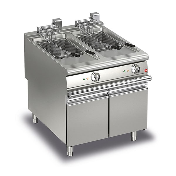 22+22L double basin electric deep fryer. Automatic temperature adjustment thermostat up to 190°C. Fire proof safety thermostat (230°C). Oil drain valves. Knobs with IPX5 water jet ingress protection rating. AISI304 stainless steel construction. Complete with four baskets and lids. Total power - 3 phase, 36kW.Dimensions: