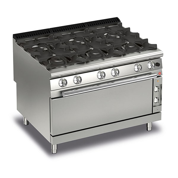 Six burner gas range with large full length gas oven. Flame failure device for burners. Knobs with IPX5 water jet ingress protection rating. AISI304 stainless steel construction. Total gas load - 196 Mj.