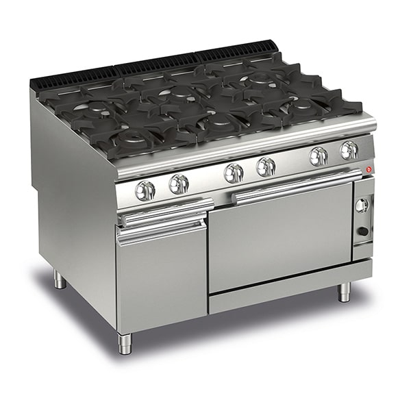 Six burner gas range with gas oven and neutral cupboard. Flame failure device for burners. Knobs with IPX5 water jet ingress protection rating. AISI304 stainless steel construction. Total gas load - 193 Mj.