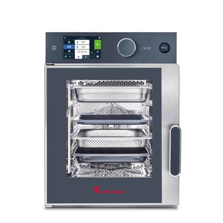 JOKER COMPACT Series electric live steam combi oven with left-hand hinged door. 6 x 1/1 GN capacity with top-mounted 7-inch Electronic Display control module. Includes fresh steam system for perfect steam generation inside the cavity. Complete with core temperature probe, inbuilt automatic washing system, 5-speed fan, triple glazed door with LED lighting, HACCP data logging, and a 5-micron water filter. Temperature range 30°C - 300°C. 3 phase, 7.8kW power supply.