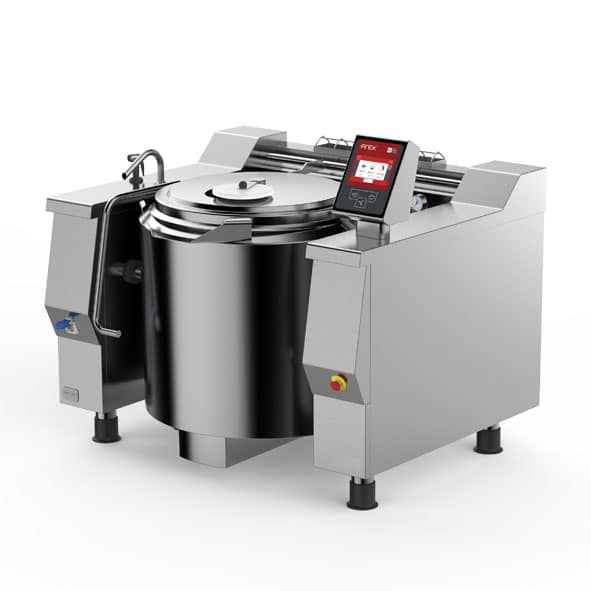 BASKETT series medium to large capacity tilting kettles with indirect steam heating and double wall jacket perfect for cooking delicate foods with capacities ranging from 105 to 500 litres. Standard with 7 inch touch screen control system for programming.