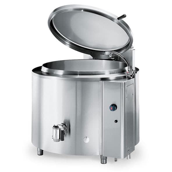 EASYPAN series large capacity cylindrical body stationary boiling pans with direct gas heating. Stainless steel construction, electromechanical controls and capacities ranging from 200 to 500 litres. Ideal for boiling large quantities of food. Double jacket water level control system as standard.